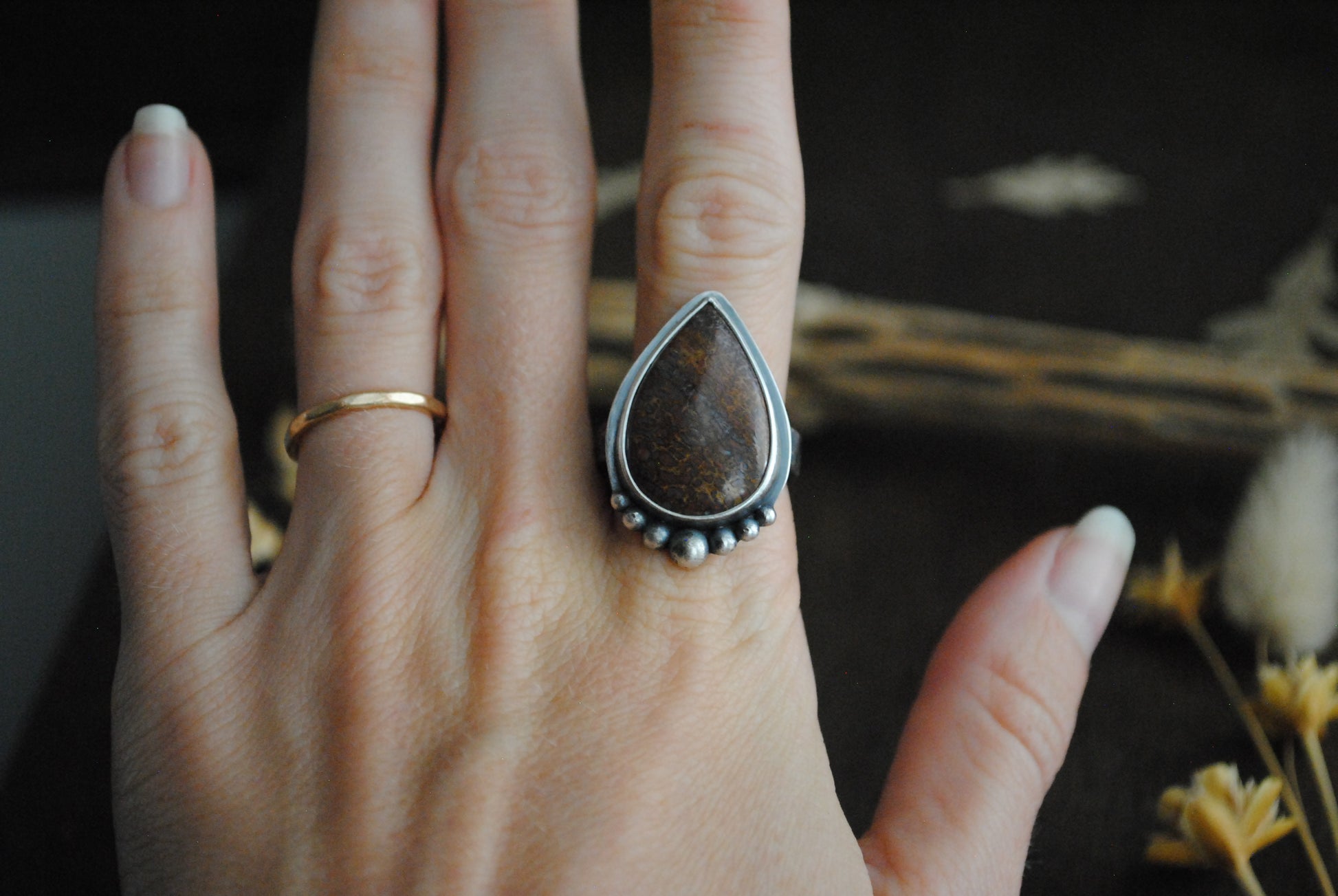 Sterling silver pear shaped dinosaur bone ring.