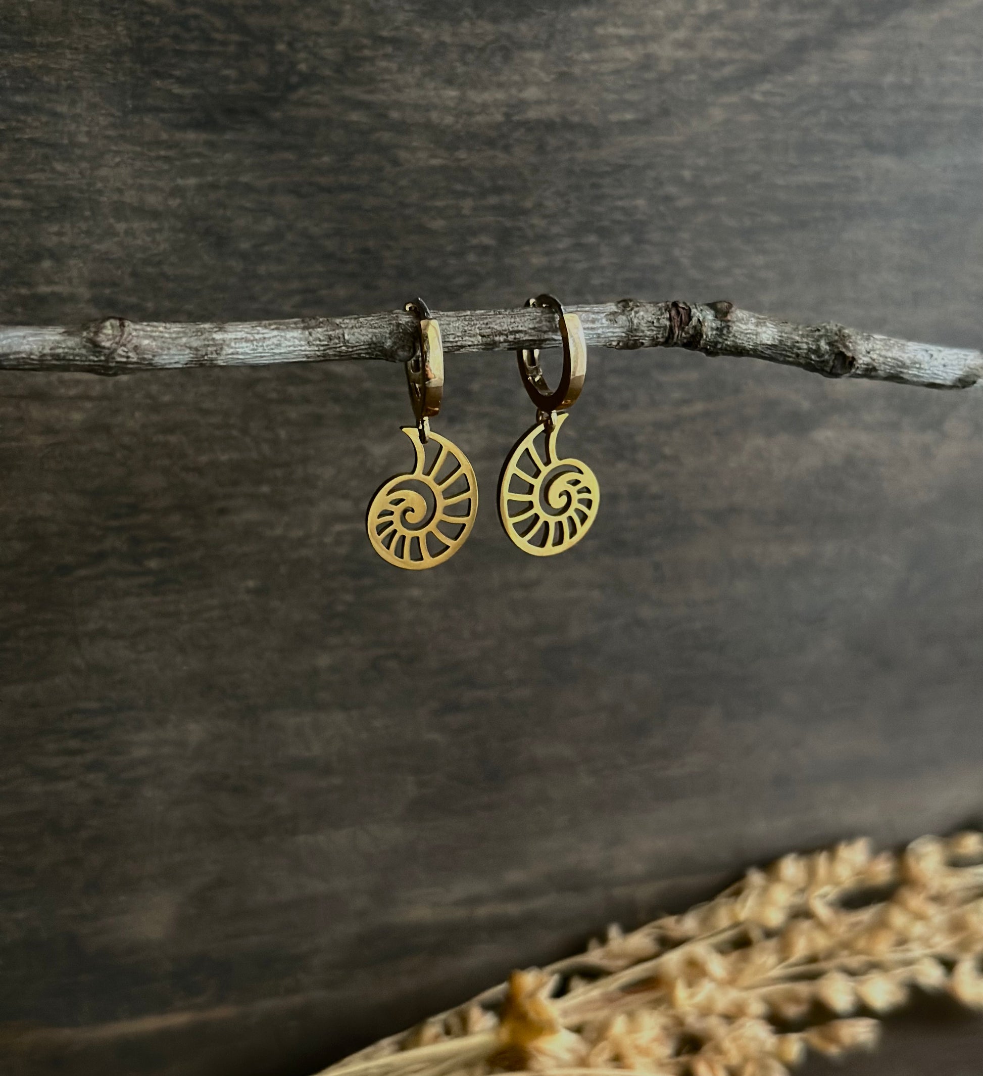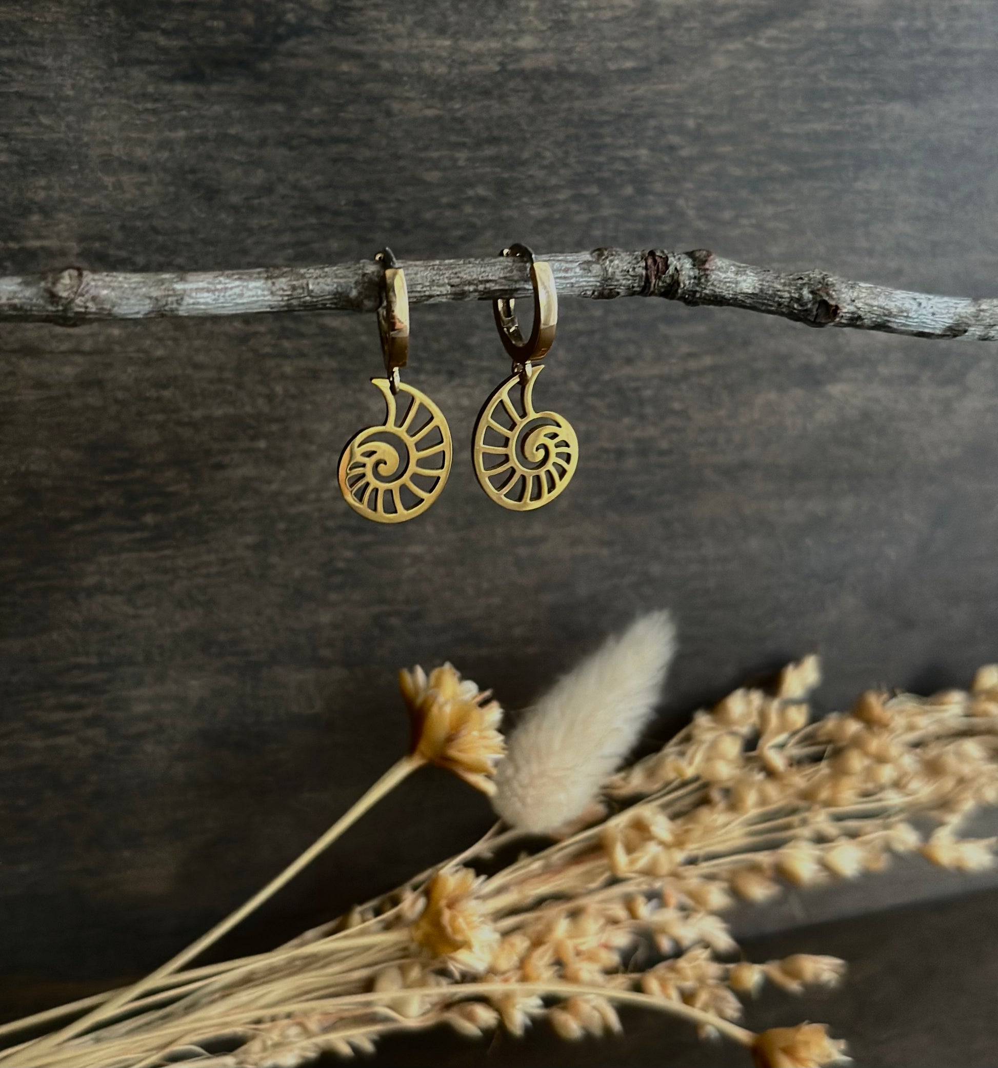 These bronze ammonite huggie hoop earrings are made of a high quality Italian alloy of copper and tin that contains an anti-tarnish compound which delays, but does not eliminate, eventual oxidation.