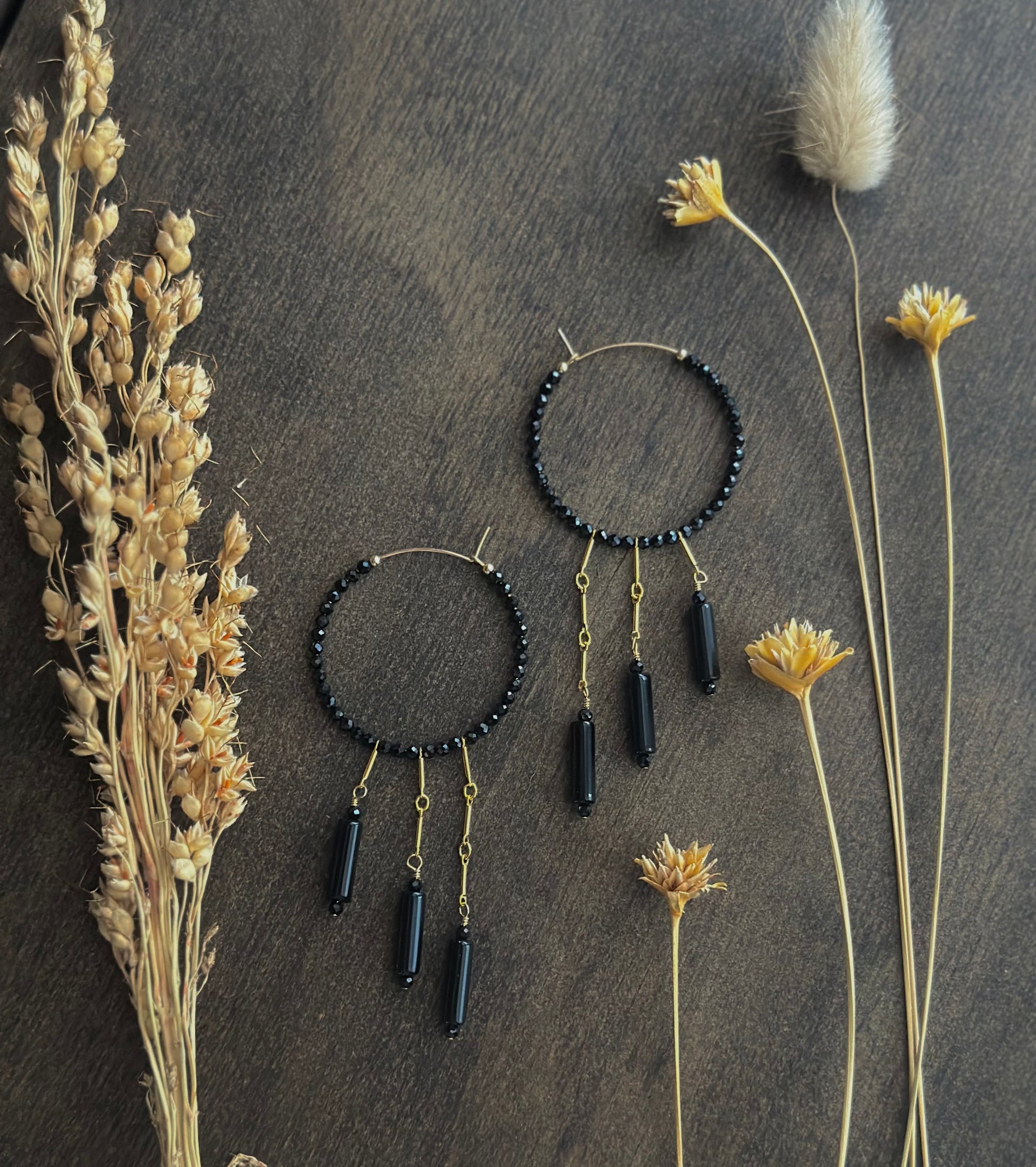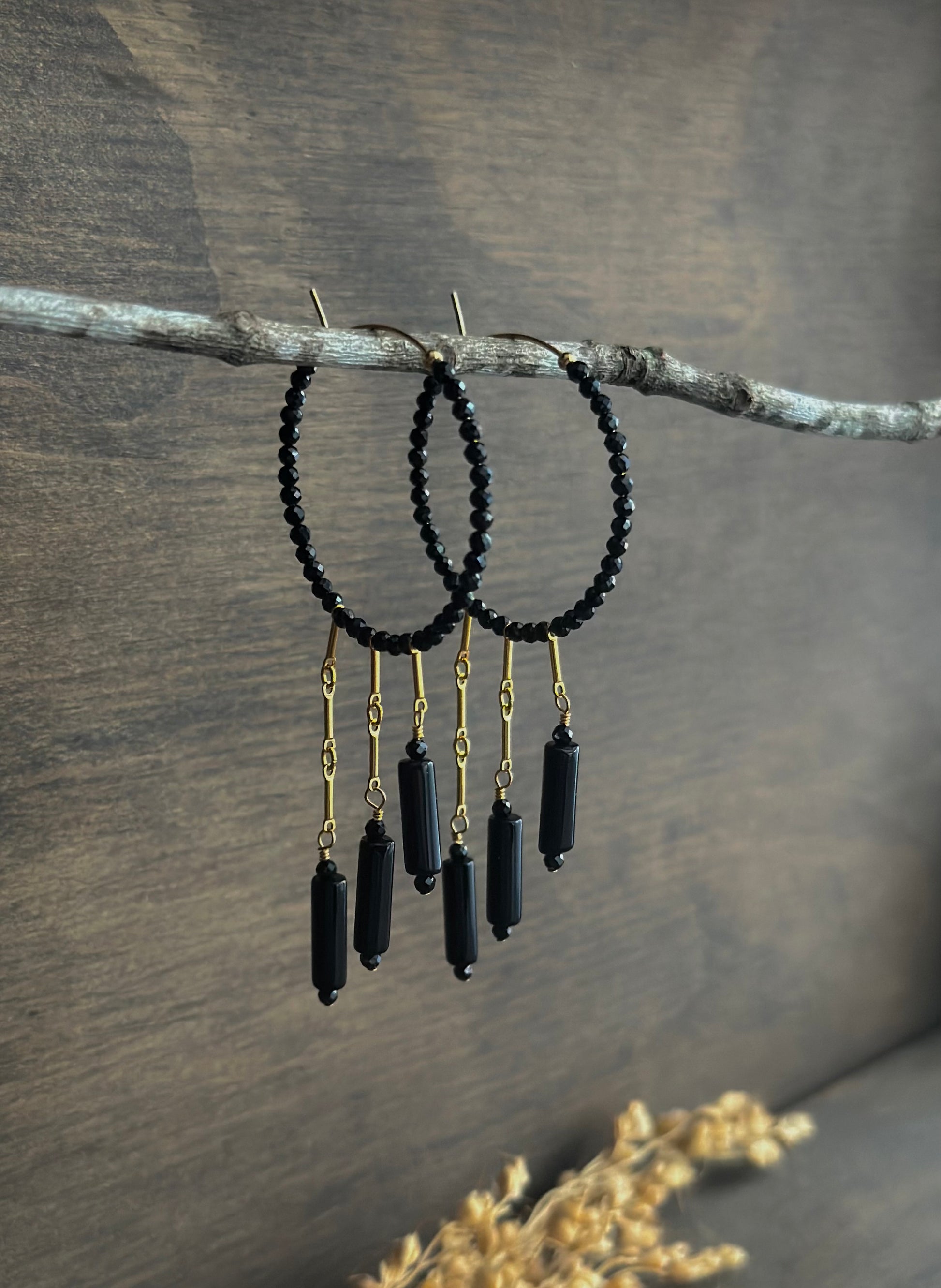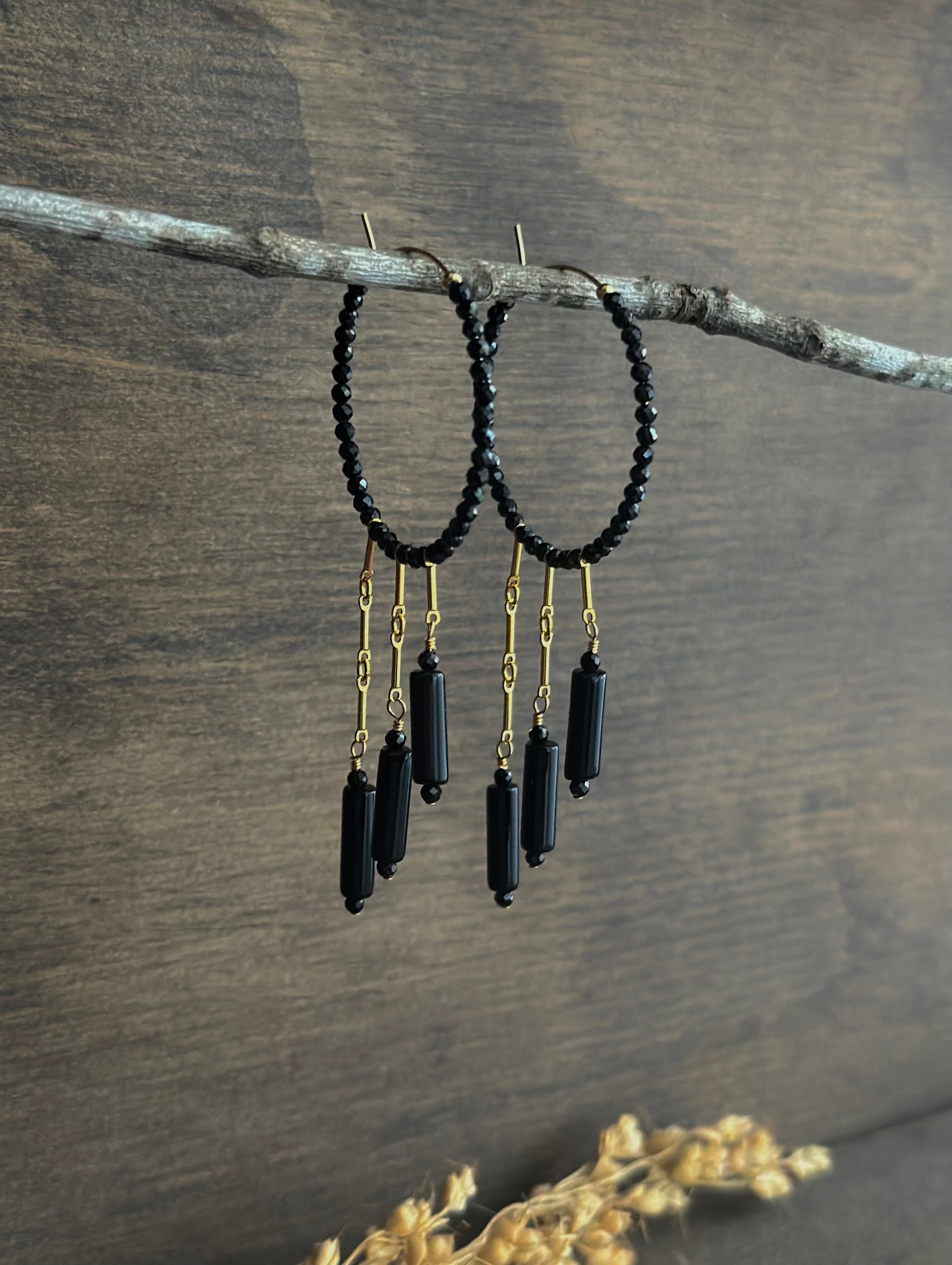 14K Yellow Gold Filled Black Spinel (hoop portion) and Onyx Fringe Hoops