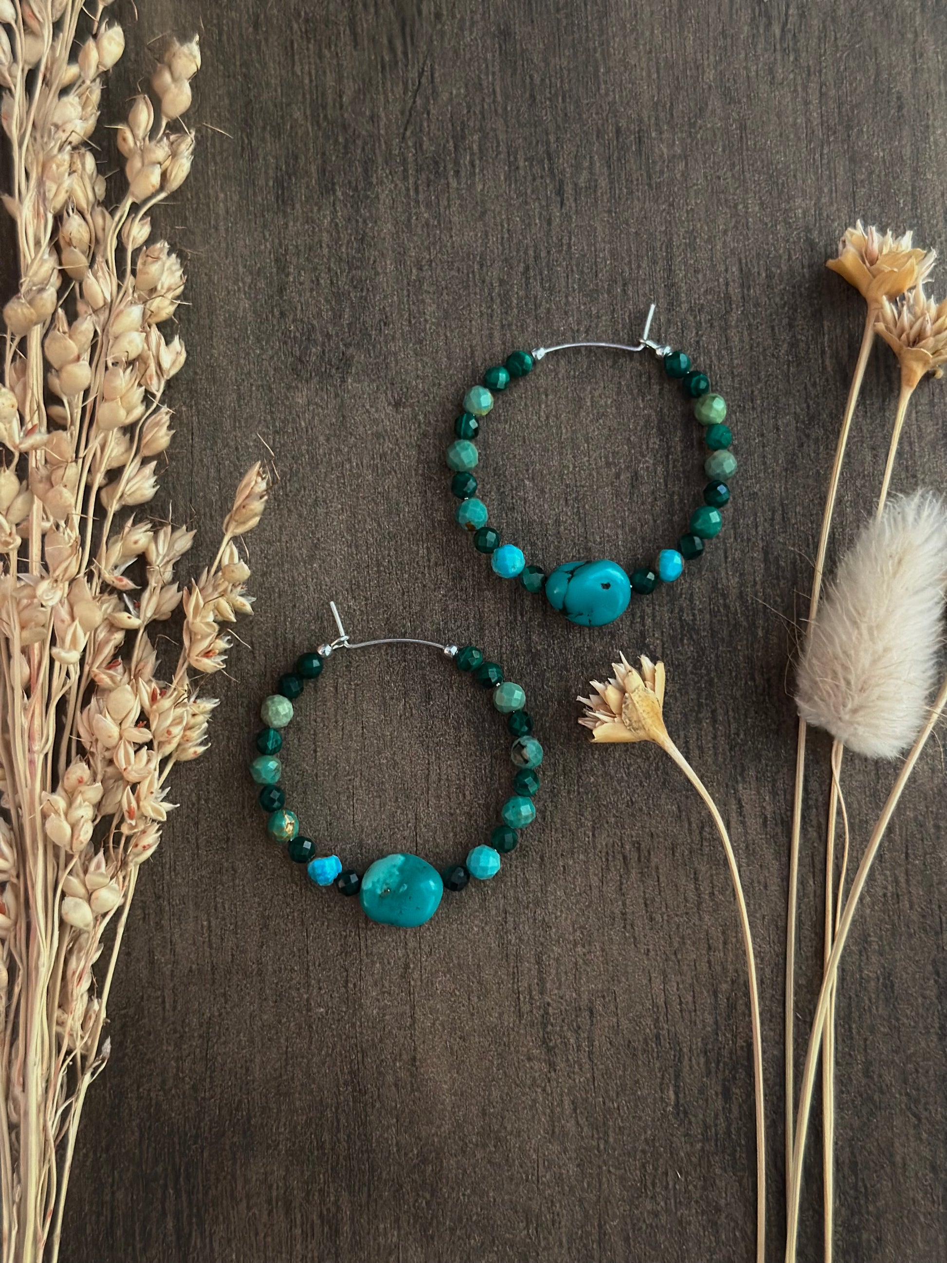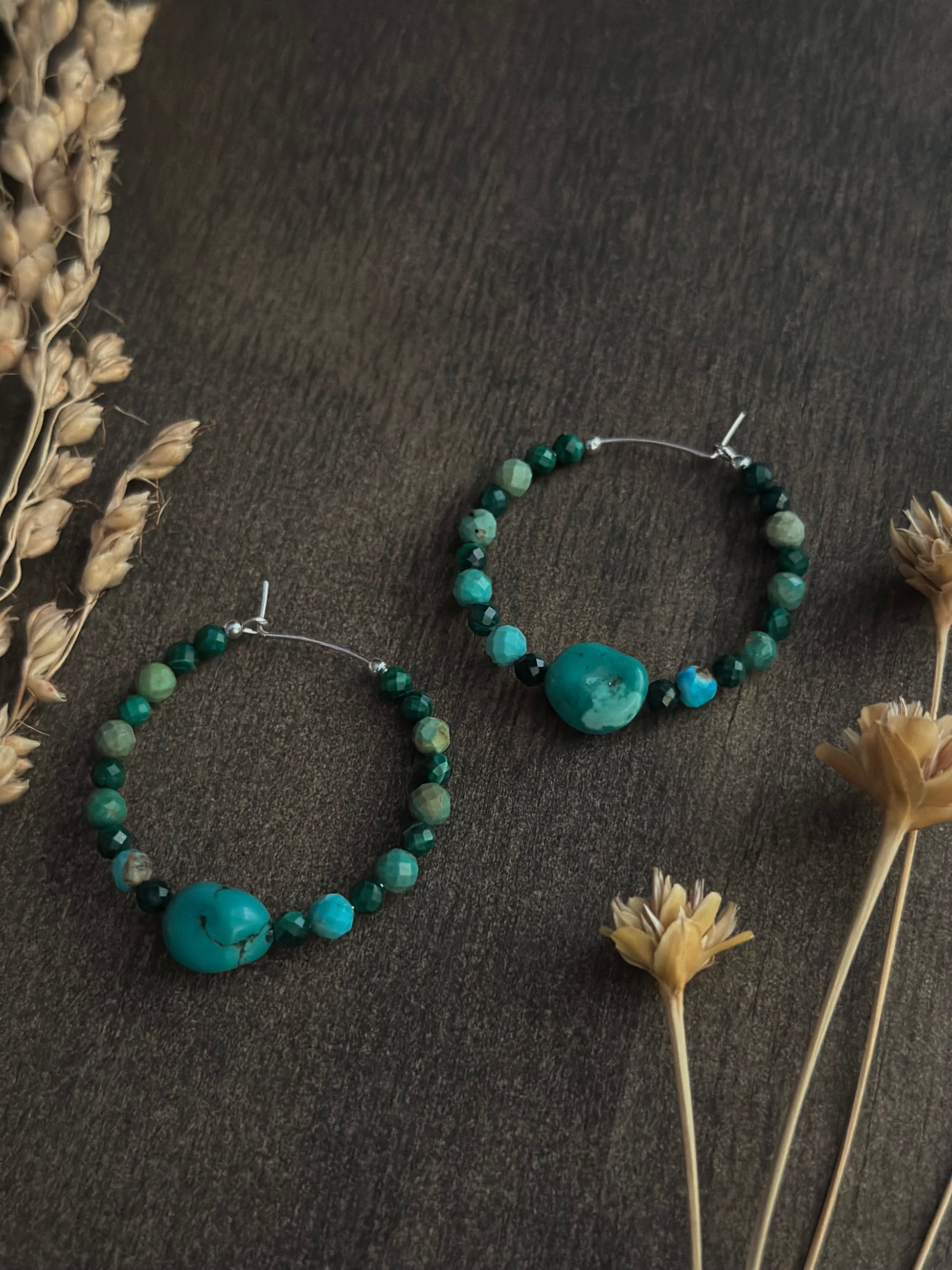 Sterling Silver AAA Malachite, Dragonskin Turquoise, and Hubei Turquoise Nugget Hoop Earrings