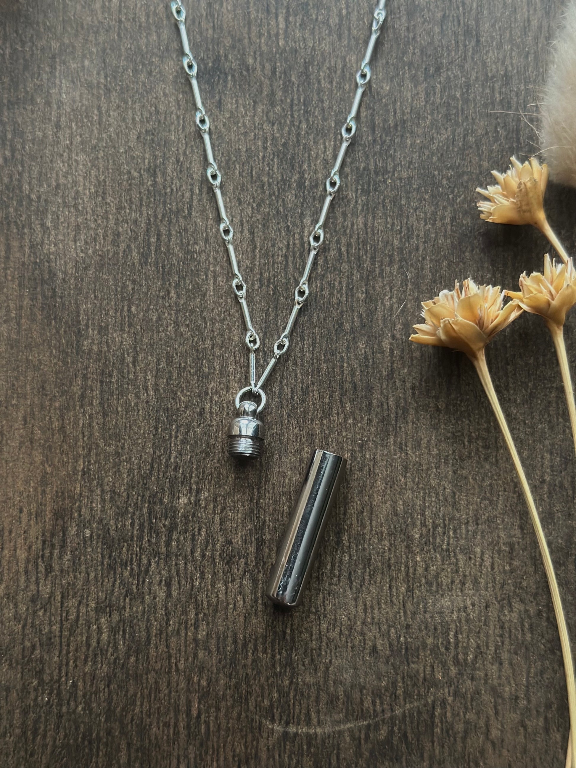 Keep your most cherished memories, pets, and loved ones close to heart with this tiny discreet vial that safely holds ashes, fur, whiskers, or a tiny piece of memorabilia that you can wear daily. The vial is made of high quality stainless steel that is rust/corrosion resistant and has a threaded closure. It is securely attached to a 18” sterling silver bar chain.
